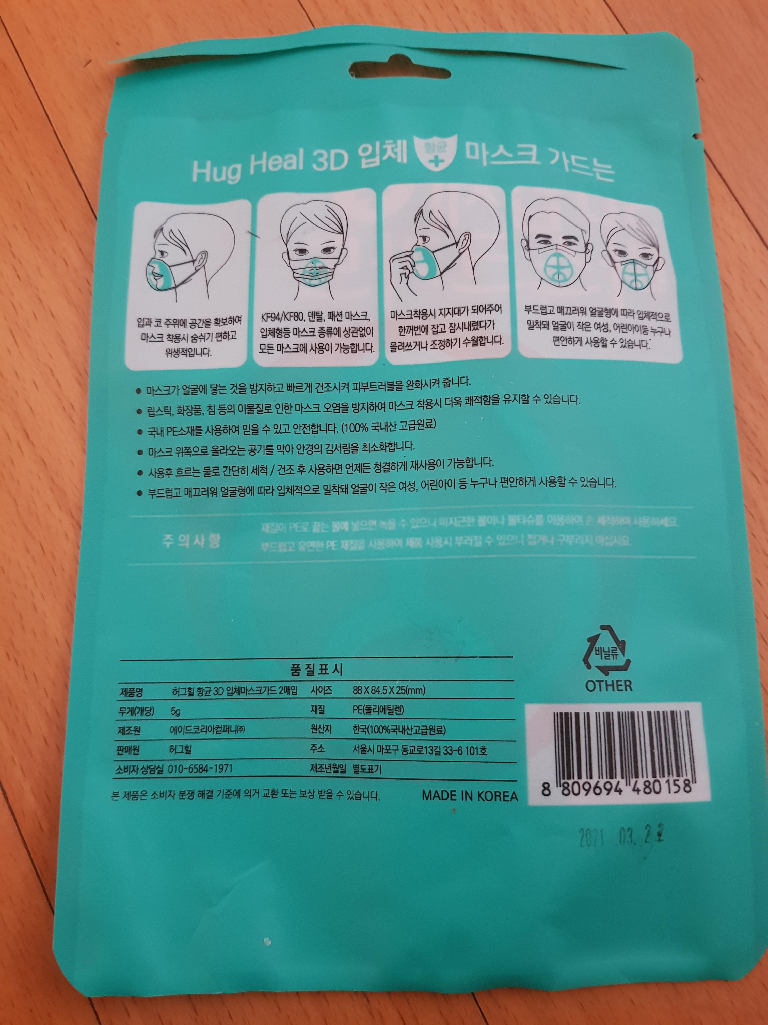 메이드인코리아 국산 제품이고 허그힐 3D 입체 항균 마스크가드 제품 2개가 들어있다. 그냥 마스크만 사용하면 뭔지 모를 갑갑함이 있었다면 이번 기회에 한번 이용해보면 좋을 듯하다.