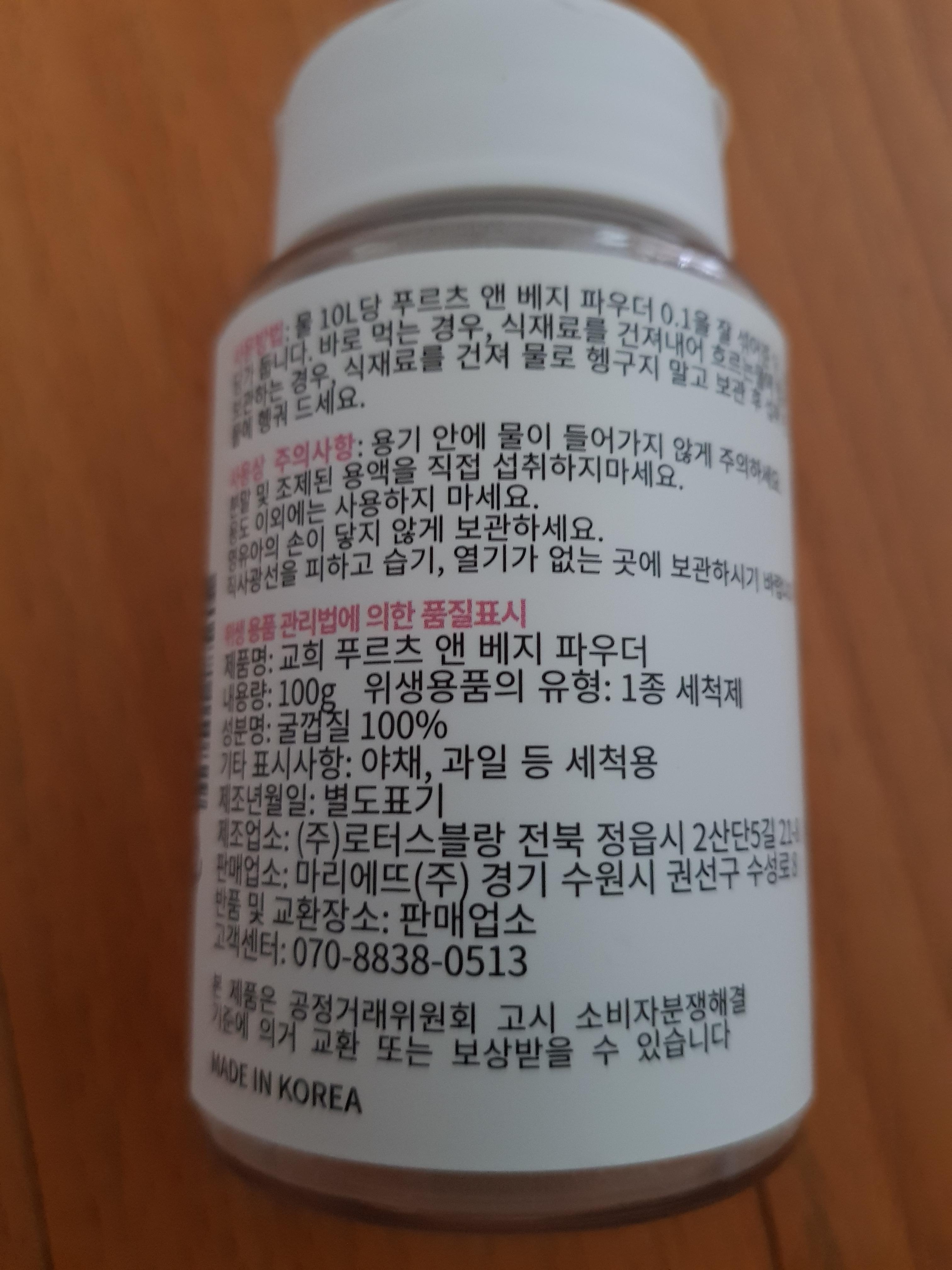 구매하면 이렇게 씰이 있기 때문에 안심하고 사용할 수 있다. 청정해역 굴껍질 외에 어떠한 화학성분도 넣지 않았다고 한다. 파우더를 물에 풀어서 3-5분 담궈두면 오염물과 유해세균 농약이 제거된다. 채소나 과일에 우리 인체에 그대로 섭취되기 때문에 깨끗하게 헹군 뒤에 섭취하거나 조리하는 것이 좋다.