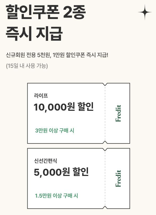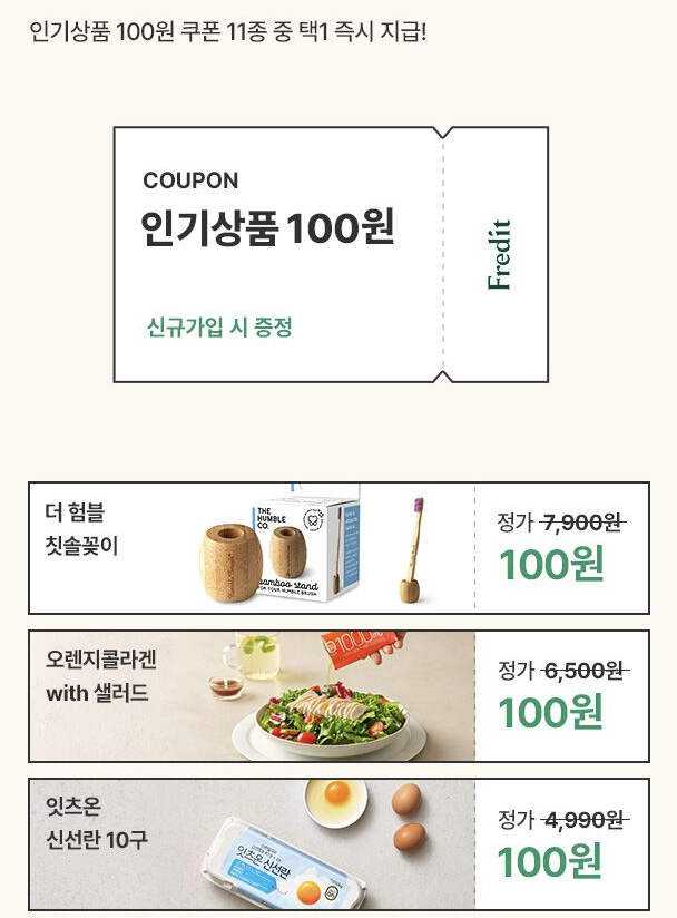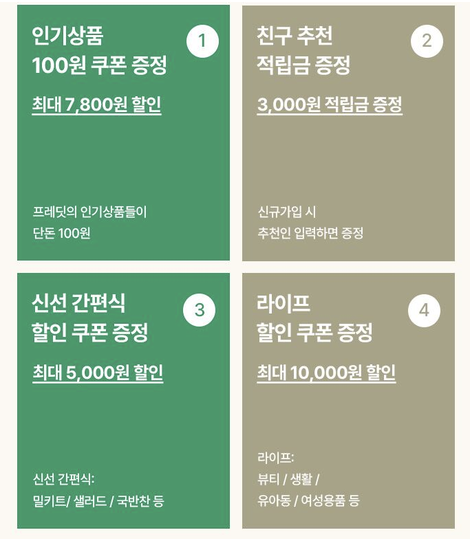 크게 봐서 4가지 혜택이 있는데 제일 마음에 드는 혜택은 프레딧 인기상품을 단독 100원에 구매할 수 있는 신규가입 쿠폰이다. 어느 제품을 골라담더라도 100원이면 거저라고 할 수 있다. 프레딧 추천인 아이디 netian3 입력하면 3,000원 적립금 받을 수 있다. 또한 신선 간편식과 라이프 할인 쿠폰이 증정된다. 신선 간편식은 먹거리라고 생각하면 되고, 라이프는 생활용품인데 뷰티, 여성용품 등이 생각보다 엄청 다양하다.