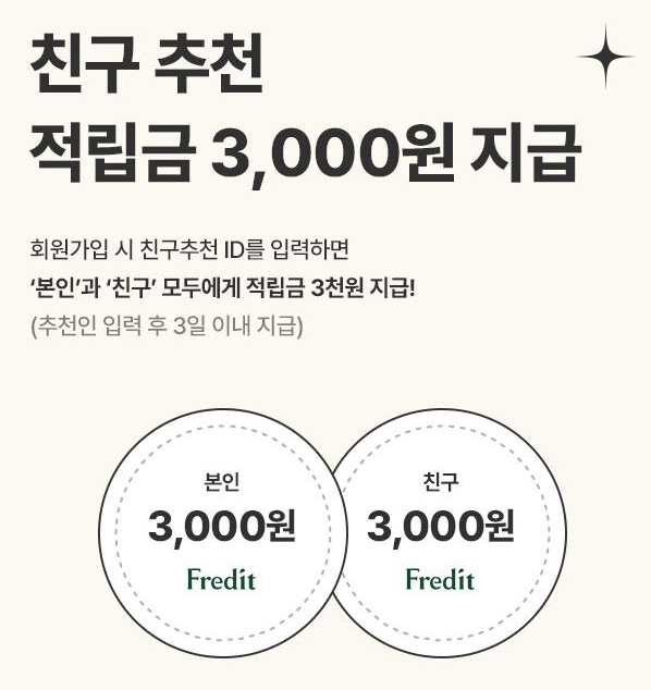 프레딧 친구추천 아이디 netian3 입력하면 3일 이내에 적립금 3천원 지급된다. 현금처럼 사용할 수 있고 할인쿠폰이 아닌 적립금이라서 최소 사용금액 제한도 없다.