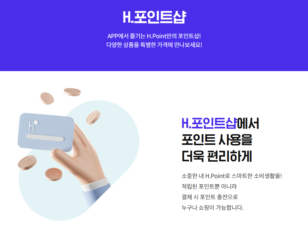 H포인트샵 통해 H.point 사용하는 것도 가능하다. 포인트샵에서는 특별한 가격에 여러 상품을 포인트로 구매할 수가 있다. 그런데 현대백화점, 현대아울렛, 그리팅몰 등에서도 사용할 수 있기 때문에 꼭 포인트샵에서만 구매해야 하는 것은 아니다.